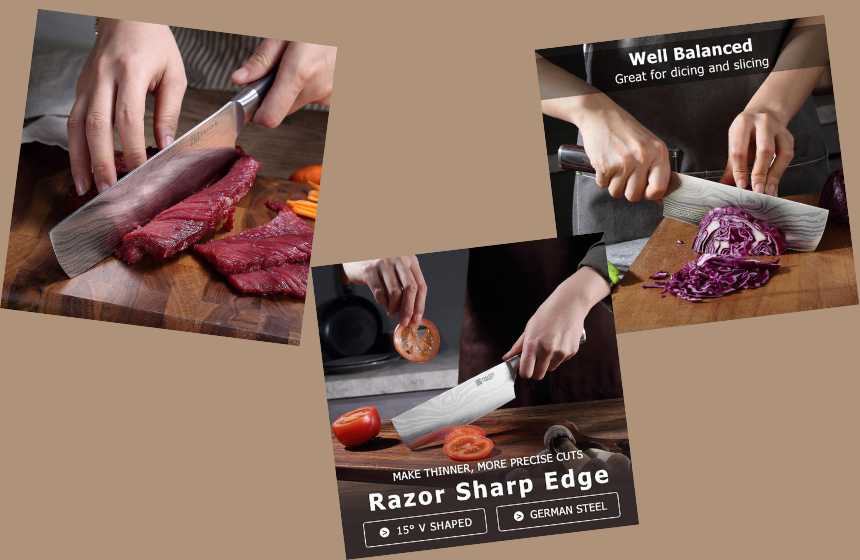 - Stunning Damascus-Style Look:Â Featuring a beautiful waved pattern, this knife provides a luxury aesthetic that stands out in any kitchen while decreasing food friction for cleaner cuts.