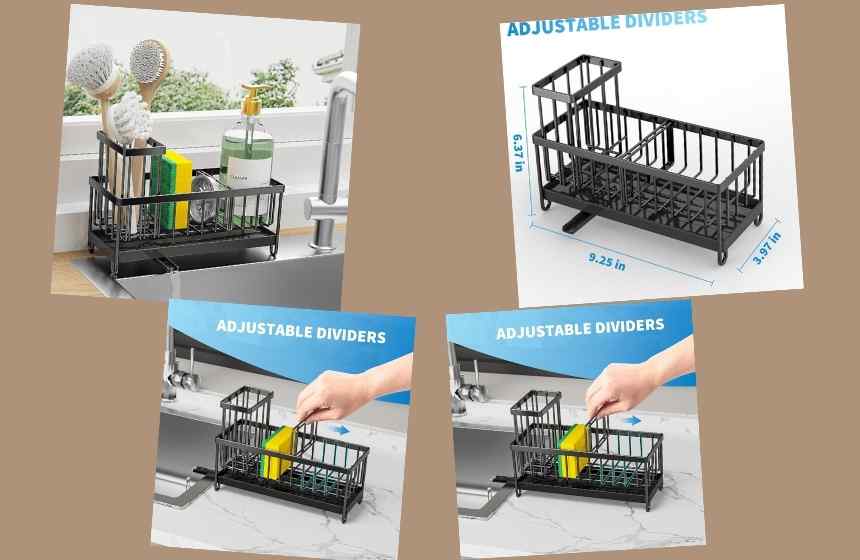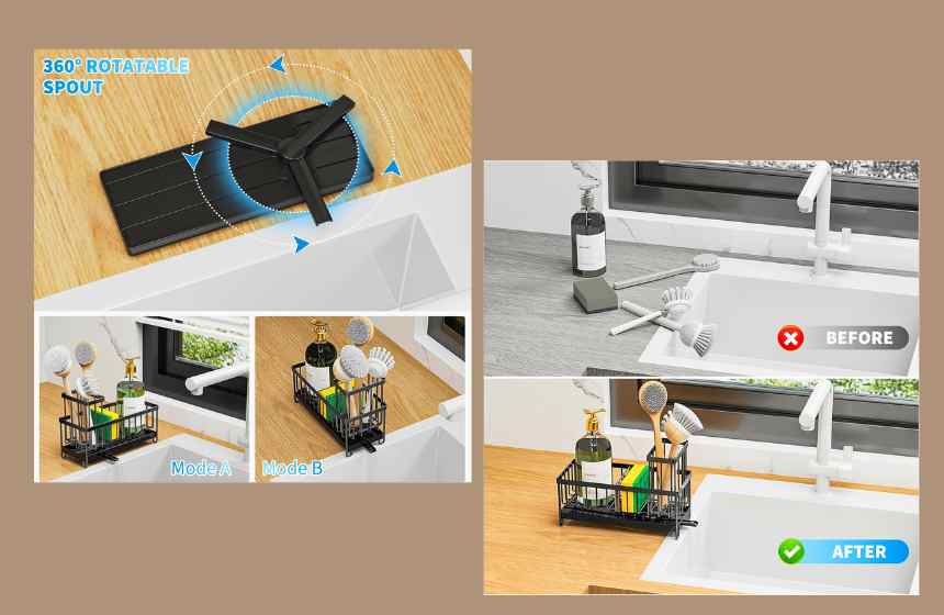 Despite its compact size (9.25″ W x 3.97″ D x 6.37″ H), this sink caddy offers excellent storage capacity. It can easily hold dishwashing essentials like detergent bottles, sponge balls, sink stoppers, and cleaning brushes. The upgraded brush holder supports up to four brushes of different sizes, giving you an all-in-one storage solution that saves countertop space and keeps your kitchen essentials within easy reach.