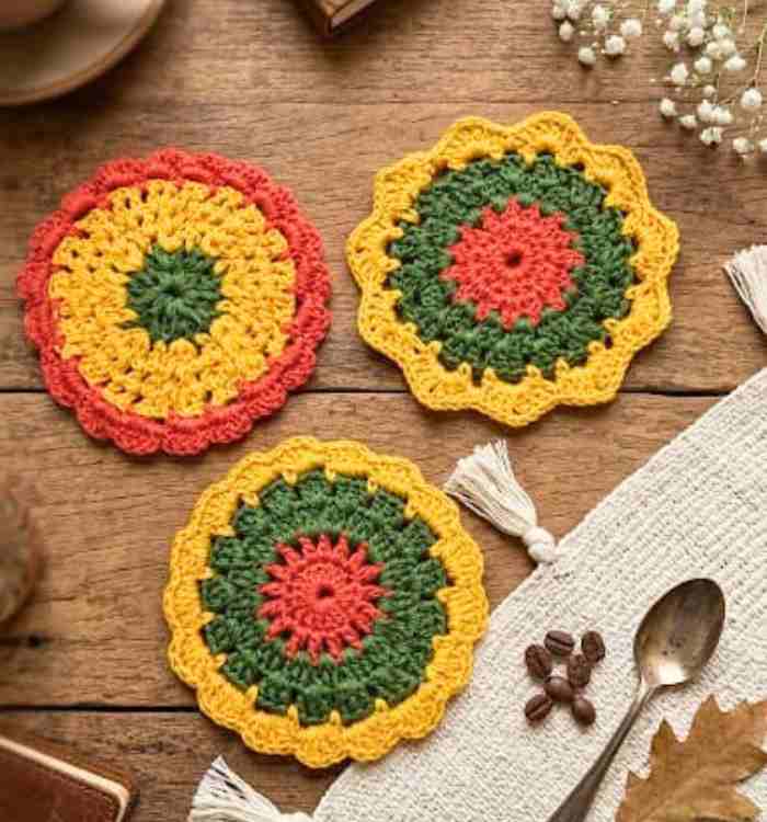 Add a cozy and stylish touch to your table with this beautiful handmade crochet coaster set. đŸ§ļ