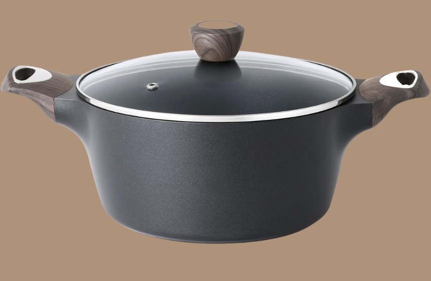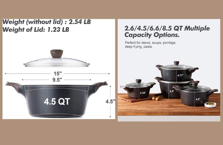 - Ergonomic Stay-Cool Handles: Designed with wood-grain Bakelite handles that offer a comfortable, anti-slip grip and stay cool while cooking. The rustic accent adds a stylish touch to the modern pot design.
